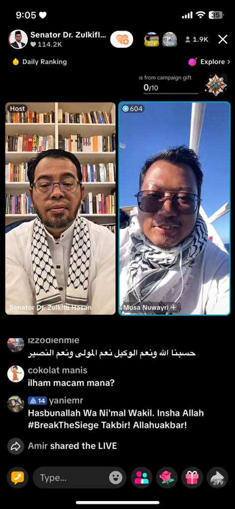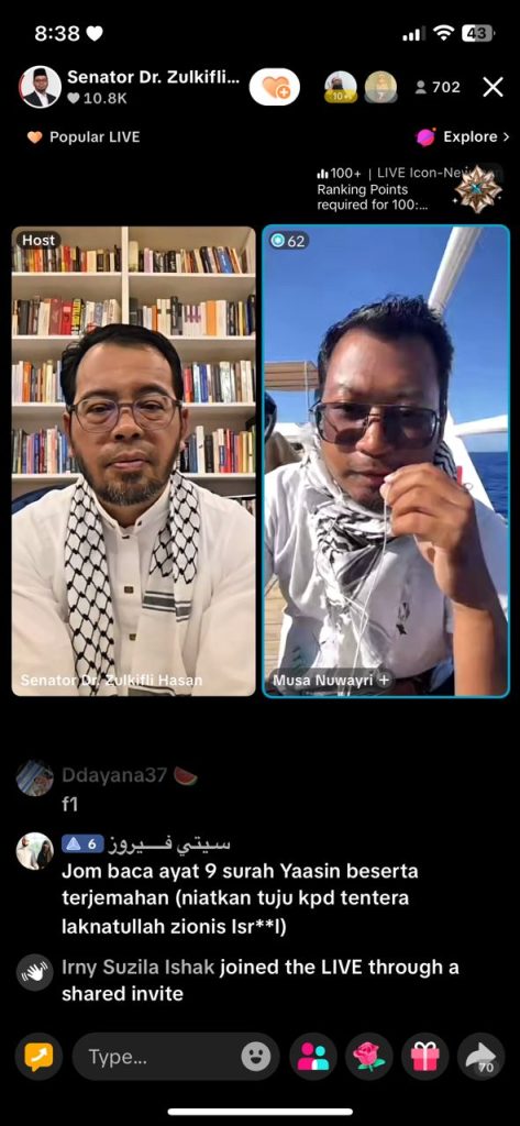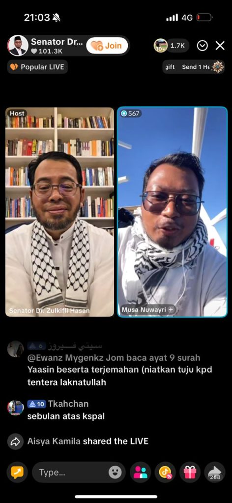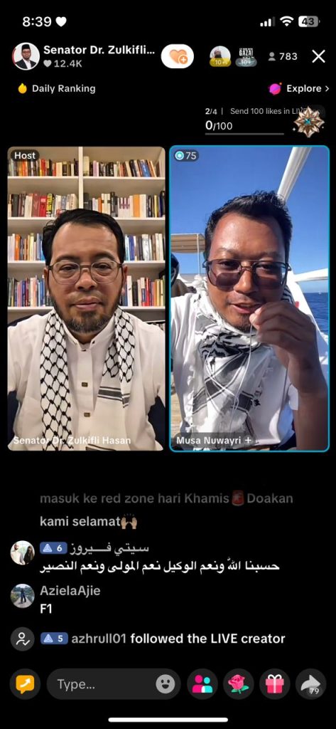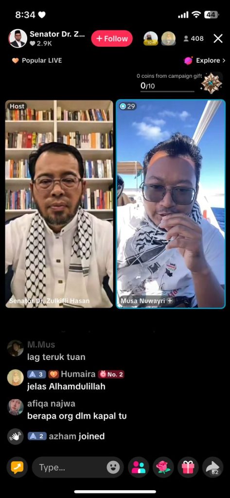 Alhamdulillah, semalam sekali lagi bersiaran langsung bersama Sdra. Musa Nuwayri di atas kapal Sumud Flotilla. Walaupun disusun dalam masa singkat, siaran langsung tersebut mendapat hampir 15,000 tontonan dan 146,700 likes – menunjukkan ramai rakyat Malaysia yang prihatin dan mengikuti secara rapat misi bantuan ini.